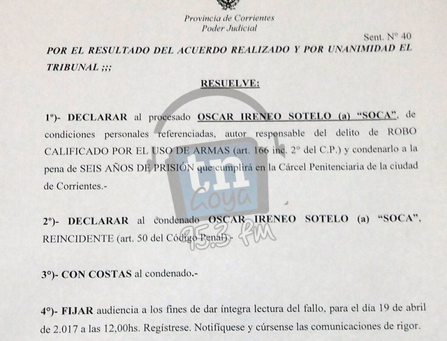En la mañana de este lunes se llevó adelante el juicio oral a Sotelo Oscar Ireneo a Soca P/ Robo Calificado por el uso de arma Goya /16. El hecho había ocurrido el 26 de Octubre del año 2016, cerca de las 22 horas Oscar Ireneo Sotelo(a) SOCA intercepto a un joven Valdez, en circunstancias que este último circulaba en inmediaciones de calle Mauricio Valenzuela, donde el antes mencionado saco un cuchillo tipo carnicero de 25 cm y este, le sustrajo la suma de aproximadamente 600 pesos y el celular marca Samsung J2 para luego huir del lugar. Por tal motivo, el T.O.P sentencio a 6 años de prisión efectiva a Sotelo.