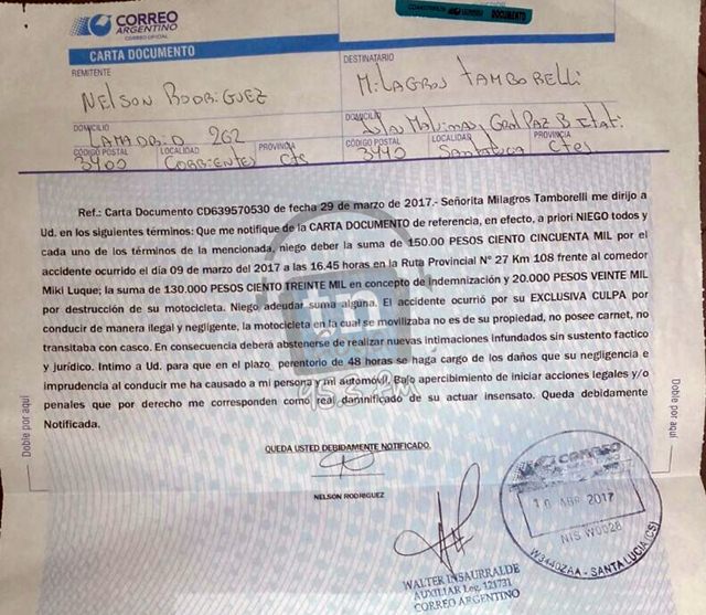 El hecho había ocurrido el 9 de marzo último, donde se dio a conocer de forma exclusiva de TNGOYA el siniestro vial que había protagonizado el jefe de la Dpec Santa Lucia el señor Nelson Rodríguez, que además de no poseer seguro el automóvil con el cual colisiono, el rodado no tiene echa la transferencia. Hoy el estado de Milagros Tamborelli es poco alentador y a quien ya han practicado su tercera cirugía y de yapa recibió una carta documento por parte de Rodríguez. Milagros pide ayuda ya que no tiene como dar la mano a su familia que sostiene a sus hijos.
