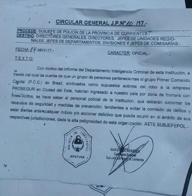 La circular oficial dice “con motivo del informe de inteligencia criminal de la Policía de Corrientes, a través del cual cuenta que un grupo de personas pertenecientes al grupo PCC de Brasil, sindicados como autores del robo a la empresa de transporte de caudales de Ciudad del Este, habrían ingresado a nuestro país por la zona de frontera, se hace saber al personal policial de la institución que deberán extremar los recaudos de seguridad y medidas de prevención tendientes a evitar la comisión de delitos”.