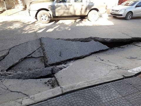 Pasada las 10 de la mañana camión arenero de la empresa Acero Construcciones de Iván Vilas circulaba por calle Entre Ríos repleto de arena entre calles Belgrano y Tucumán rompió el asfalto por causa del sobrepeso que llevaba y a los pocos metros reventó neumáticos. El propietario en contacto con el periodista Juan Cruz Velásquez afirmo que se va a hacer cargo de reparar el daño causado.