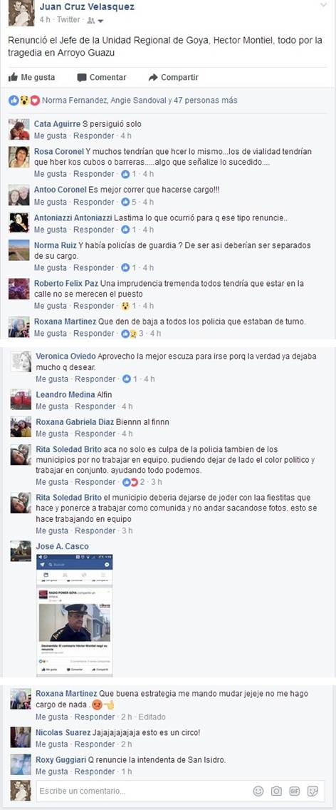 En redes sociales muchos ciudadanos de Goya, celebraron la noticia de su alejamiento de la fuerza, debido a los diferentes hechos delictivos callejeros y a casas de familias, manifiestan que debe dar un paso al costado por no poder controlar la inseguridad.