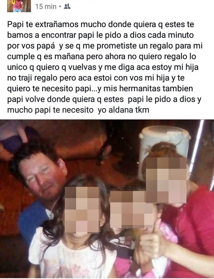Una de las hijas de Rogelio Schweig, le escribió un mensaje en las redes sociales a su padre, hasta el momento desaparecido, en el Arroyo Guazú: "Papi, mañana es mi cumple..y el mejor regalo sería que vuelva, te extrañamos y queremos mucho", es parte de la conmovedora publicación.