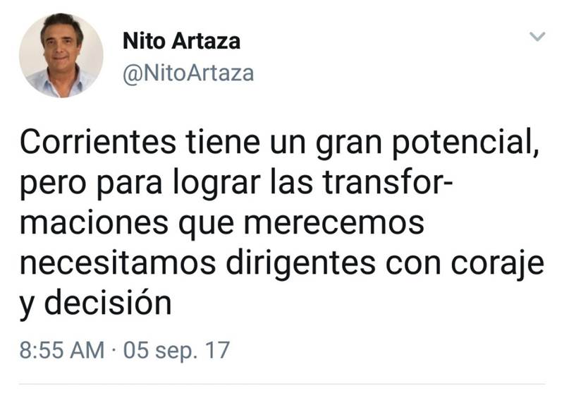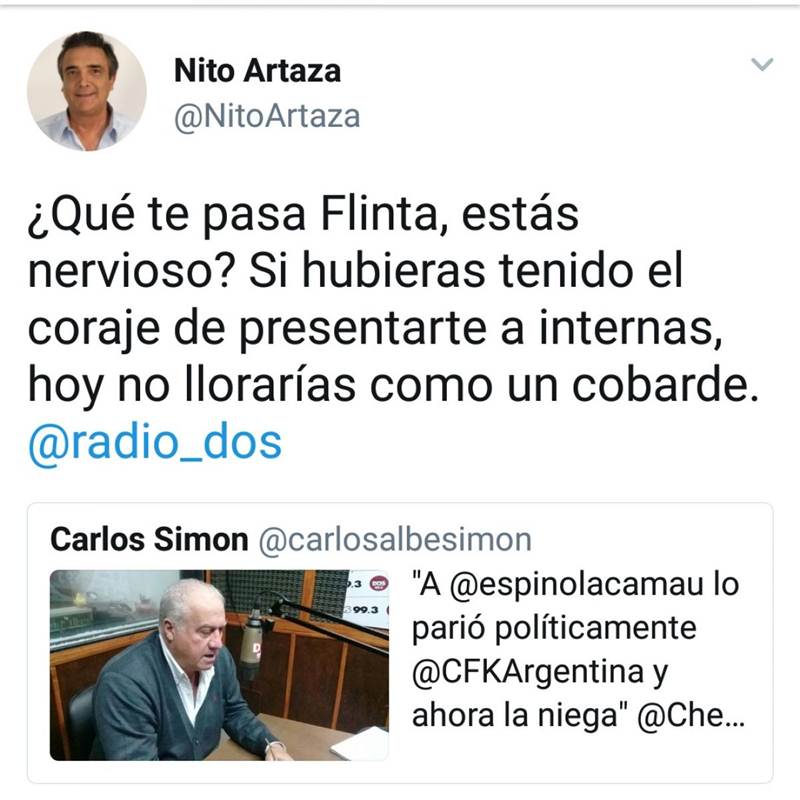 Rápido de reflejos, Nito Artaza utilizó la red del pajarito para responder a los dichos de Sergio Flinta en La Dos. "¿Qué te pasa Flinta, estás nervioso? Si hubieras tenido el coraje de presentarte a internas, hoy no llorarías como un cobarde", escribió el candidato a Vicegobernador.