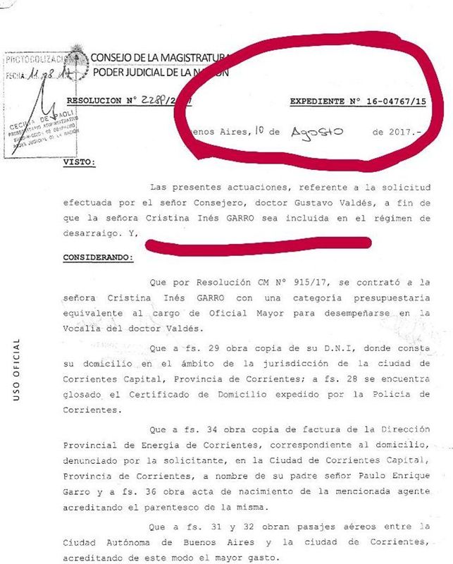 Según la resolución a la que accedió LPO, fue el propio Valdés quien solicitó la incorporación de su esposa para desempeñarse en la vocalía que el diputado integra. En el expediente consta que el radical correntino incluso solicitó para Garro el beneficio del desarraigo.