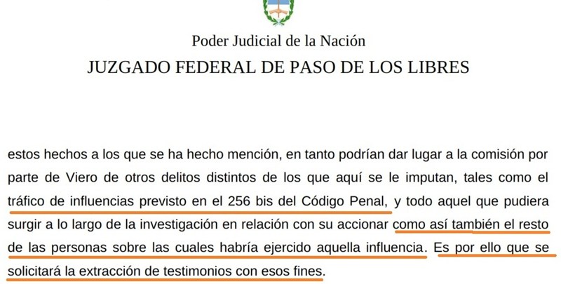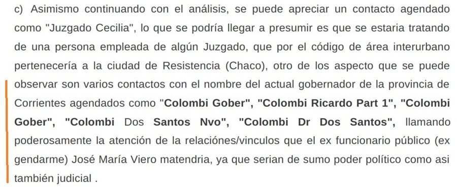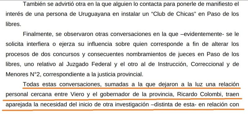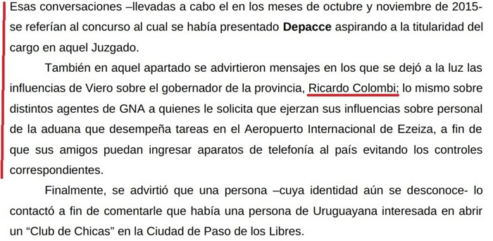 Ya no se trata de especulaciones que vinculan a Colombi con personas ligados a delitos complejos en la región. Esta vez, la jueza Pozzer dejó en claro la relación que mantenían hasta 2015 Colombi y el excomandante de Gendarmería, José María Viero, quien está procesado con Benito Pont y otros en la causa por el supuesto delito de trata. El diario 1588 tuvo acceso al expediente N°7789/2015, firmado el 4 de septiembre pasado, y con la firma de la jueza Pozzer. La magistrada procesó allí al exfiscal federal, Benito Pont, a Viero y otros por delitos vinculados a la explotación sexual de mujeres en varios prostíbulos de Libres. Es decir, Colombi aparece mencionado en el expediente de procesamiento de la causa más grande y conocida en el territorio de la provincia de Corrientes por el delito de trata, al punto de que un exfiscal (Pont), exjefe de Gendarmería y excomerciantes están procesados y podrían ser condenados en caso de que la causa se eleve a juicio oral en 2018. En el mismo texto judicial, la magistrada describe que Viero y Colombi mantenían conversaciones telefónicas, cita números de teléfonos celulares y nombres de contactos agendados. La jueza señala que esos diálogos estaban vinculados a la postulación del abogado Jorge Depacce para juez de Instrucción de Paso de los Libres. El exgendarme, entonces en funciones, le sugería a Colombi si debía aprobarse o no en el Senado provincial ese pliego para que Depacce sea magistrado de la Provincia. “En tal conversación también se observa su influencia sobre el gobernador de la Provincia de Corrientes, Ricardo Colombi”, dice la jueza en la página 55 del expediente. Tras considerar escuchas telefónicas, la jueza escribió en el texto de procesamiento: “Todas estas conversaciones, sumadas a las que dejaron a la luz una relación personal cercana entre Viero y el gobernador de la provincia, Ricardo Colombi, traen aparejada la necesidad de otra investigación –distinta de esta- con relación a estos hechos a los que se ha hecho mención”. Seguidamente, la jueza Pozzer sostuvo: “Es por ello que se solicitará la extracción de testimonios con esos fines”. La jueza Federal entendió - y dejó por escrito- que podrían investigarse otros delitos “tales como tráfico de influencias previstos en el 256 bis del Código Penal y todo aquel que pudiera surgir durante la investigación”. El expediente en el que Colombi aparece mencionado como posible sujeto a ser investigado tiene 467 páginas, con fecha del 4 de septiembre pasado y llegó a la Cámara Federal de Corrientes para que avance el proceso contra Viero, Benito Pont y otras personas –no conocidas- que fueron procesadas por el delito de trata. La jueza deja en claro una fluida relación entre Colombi y el excomandante procesado: “Hay conversaciones con un contacto agendado como “Vallejos Flor Uruguaiana” que sería una pareja de Viero. En una de estas conversaciones es posible encontrar que Viero se habría reunido en varias oportunidades con el gobernador de la provincia de Corrientes, Ricardo Colombi”. Así lo escribió la jueza en la página 54 de expediente. Varios locales nocturnos de Paso de los Libres y sus alrededores funcionaron, según el expediente, como prostíbulos donde se comerciaba con mujeres explotadas sexualmente. Se trata de una “promoción o facilitación de la prostitución”, según los artículos 125 bis, 127 bis y 145 bis del Código Penal. La denuncia contra los procesados por el delito de explotación sexual en Corrientes la radicó la Procuraduría de Trata de Personas y Secuestros Extorsivos (Protex). Este es el segundo expediente por delitos federales en el que aparece el nombre de Ricardo Colombi. En otro caso, el gobernador aparece mencionado en la agenda personal secuestrada a Hilda Calabrese, una mujer que en abril pasado fue condenada a 20 años de prisión por el delito de asociación ilícita en narcotráfico en una estancia de Santo Tomé, en la denominada causa de “narcoaviones”. A partir de ahora, se cree que los fiscales federales de Corrientes podrían solicitar que se inicie una nueva investigación, tal como lo sugiere la jueza Pozzer, y determinar la participación de Colombi en los casos mencionados. ¿Cómo agendaron a Colombi? Dice la jueza Pozzer en la página 223 del expediente: “Otro de los aspecto que se puede observar son varios contactos con el nombre del actual gobernador de la provincia de Corrientes agendados como "Colombi Gober", "Colombi Ricardo Part 1", "Colombi Gober", "Colombi Dos Santos Nvo", "Colombi Dr Dos Santos", llamando poderosamente la atención de la relaciones/vínculos que el exfuncionario público (exgendarme) José María Viero mantendría, ya que serían de sumo poder político como así también judicial .”