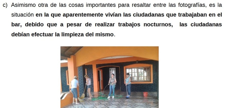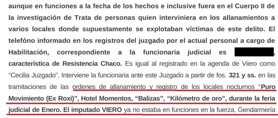 “Hoteles” En la página 224, el expediente transcribe el registro de los locales nocturnos, supuestos prostíbulos, investigados con los nombres de: “Puro Movimiento (Ex Roxi), Hotel Momentos, Balizas, Kilómetro de oro”. Según la investigación, al menos 30 mujeres, oriundas de Paso de los Libres y otras localidades correntinas de la zona, eran promovidas para ejercer la prostitución, según fuentes de la investigación.