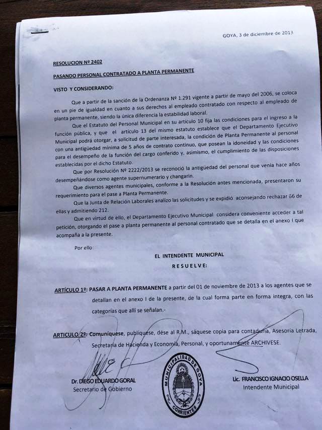 El concejal Pereira recordó que el intendente electo Ignacio Osella firmo el pase a planta permanente de 212 personas el 3 de diciembre 2013, 7 días antes de dejar la intendencia, donde además, a través de la resolución Nº 2.222 conocida en ese momento del 2x1, sin el aval correspondiente del HCD local, se abrió una puerta al pase a planta permanente a trabajadores que solo tenían 1 años de contrato, con 4 años de trabajo en negro en la municipalidad de Goya avalando algo que no existe ni existía en el estatuto municipal del empleado. A pesar de ello la resolución sigue vigente donde al día de hoy los 212 trabajadores que Osella paso a planta en el 2013 continúan en el municipio. (Lea resolución completa y fecha)