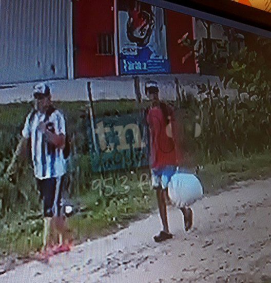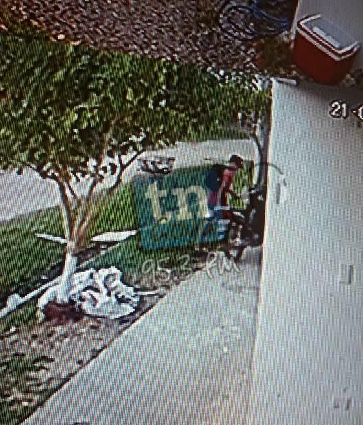 La misma cámara que capta al ladrón en escena, lo filmo minutos antes cuando cruza por el frente de la vivienda con otra persona, y mira hacia donde estaba la motocicleta.