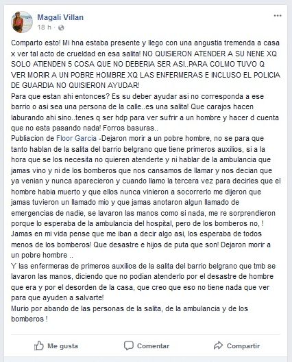 Un hombre de apellido Monzón habría fallecido cerca de un CAPS de Goya sin ser atendido prioritariamente por el servicio de ambulancias del Hospital local. Por otra parte denuncian que a pesar de los reiterados llamados al servicio de ambulancias del Hospital Zonal y a los Bomberos, ésta tardó en llegar, lo que habría contribuido al deceso del hombre. Una vez arribado el vehículo al lugar, el cuerpo del mismo incluso se les habría caído de la camilla a los asistentes, relataron testigos del hecho. A continuación, la publicación de una vecina y una testigo de lo ocurrido: