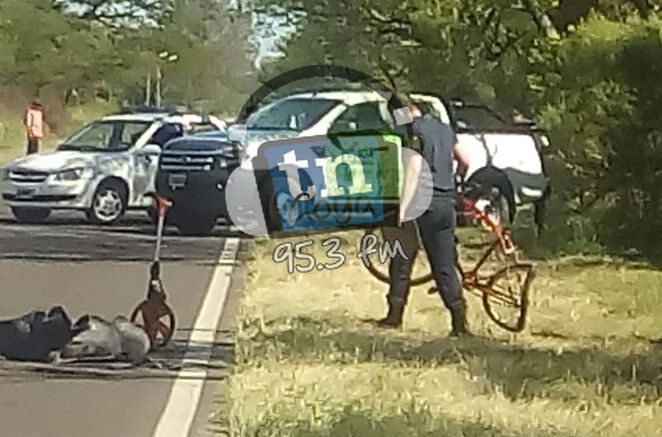 El siniestro: los chicos en bicicleta y el auto transitaban de sentido sur norte por RN 12 KM 790 a pocos metros del acceso sur a Goya, donde el auto los atropella por detrás. La rueda trasera de la bicicleta quedo toda doblada levantándolos por el aire. Trabajan en el lugar peritos, médico policial y personal de la comisaria primera.