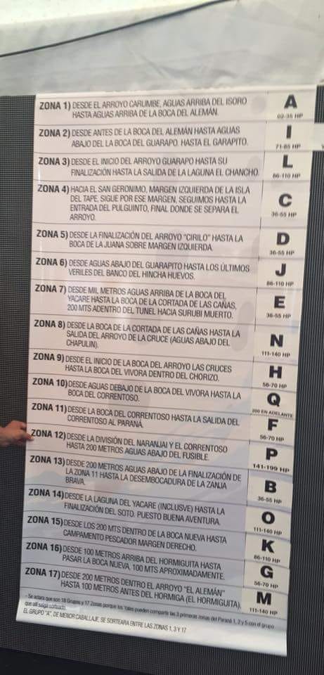 Pasada la hora 08,00 se llevó a cabo en la Carpa de Pescadores instalada en el Predio Costa Surubí, el sorteo de las zonas de pesca que le corresponden a cada uno de los grupos en que se dividen los participantes, teniendo en cuenta el tipo de embarcación la potencia de las mismas, con la presencia del Presidente de la COMUPE, Samuel Cáneva, del Fiscal General Lorenzón, del Responsable del Logística Juan Cenóz, entre otros miembros de la organización. Fue fiscalizado por la escribana Lisa Piasentini y dos pescadores fueron quienes extrajeron las bolillas.