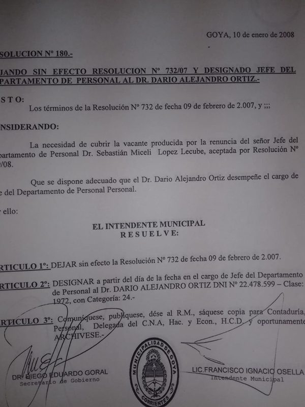 La denuncia la había realizado el intendente Ignacio Osella en el juzgado de su ex abogado personal en la causa contra Dario Zapata y hoy juez de instrucción Darío Ortiz quien hasta el año 2009 también fue jefe de personal de la municipalidad de Goya en la gestión de Osella por la habilitación del HCD local al pago a término al ejecutivo municipal. La indagatoria recayó en los 10 concejales del FPV de la gestión de Bassi, entre ellos, Monzón, Baldi, González, Ramírez, Kalemberg, Pereira, Reyes, Ginochi, Guerreño e Ibañez. Lo cierto es que recusaran a Ortiz de la causa por su fuerte vínculo con Osella y además le iniciaran un juicio político por incumplimiento de deberes de funcionario público.