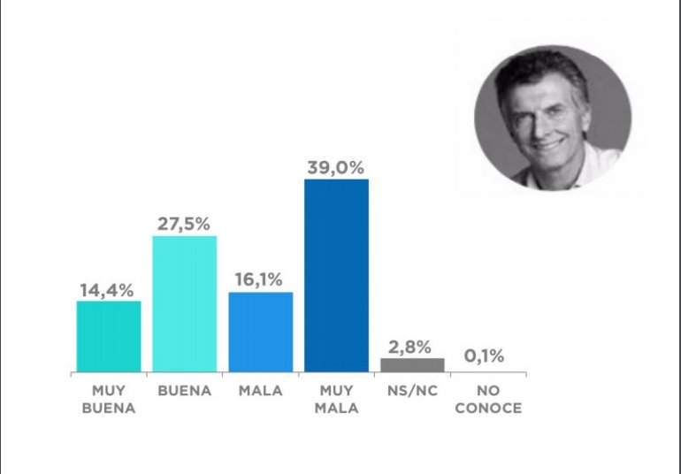 El 49 por ciento de los encuestados desaprueba la gestión del gobierno nacional y el 11,6 por ciento desaprueba algo de su gestión. El 39 por ciento de los encuestados considera muy malo el desempeño de Macri y el 16,1 lo considera malo.
