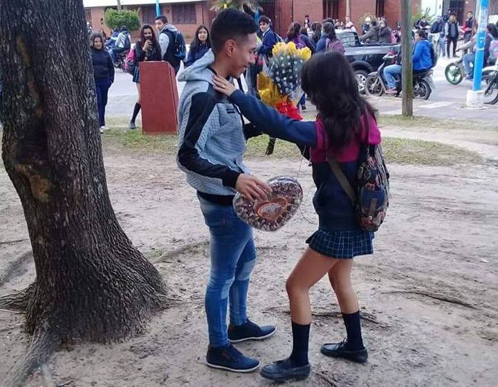 El se llama Javier y ella Abigail y sorprendieron a todos con una demostración de amor, cuando Javier la espero a ella a la salida de la escuela para declararle su amor con flores amarillas y una caja de bombón frente a todos. La foto se hizo viral y enterneció a todos en las redes sociales. A partir de hoy en muchas parejas se comenzó a escuchar, “a ver si alguna vez haces lo mismo”.