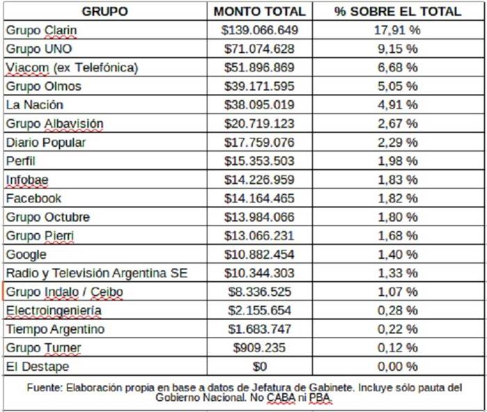 El Grupo Clarin se lleva casi el 18% de la pauta oficial de Gobierno Nacional, un porcentaje estable desde que asumió Macri. Esta relación privilegiada hace que los demás medios lo corran de atrás. En lo que respecta a pauta oficial, el Grupo Uno, que maneja Daniel Vila, recibe apenas la mitad que Clarín. El podio lo completa Viacom, los dueños de Telefé y sus canales provinciales, con poco más de un tercio de lo que obtiene Clarín.