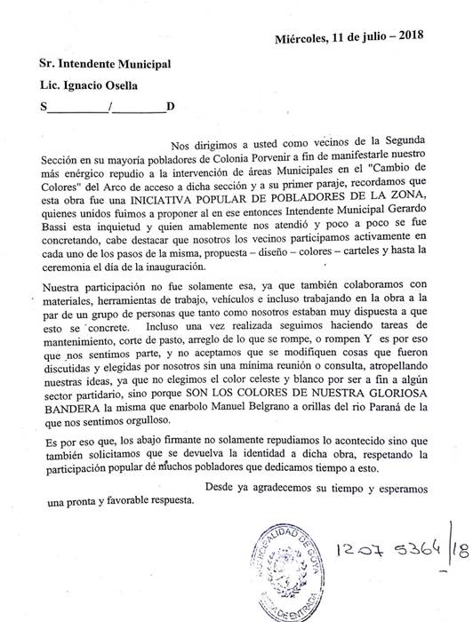 El repudio formal ingresó por Mesa de Entrada de la Municipalidad de Goya el jueves y está dirigido al intendente Ignacio Osella. Como se puede leer en la copia a continuación, lo que enoja a los vecinos es la intervención de áreas municipales en el cambio de colores que se realiza desde el cambio de gestión en todos los espacios públicos.