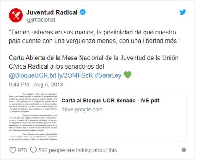 La juventud del radicalismo calificó el debate que se dará en dos días en la Cámara alta como un "momento histórico", como un "momento en que podemos quitar el velo de silencio y oscuridad que durante años ha cubierto la muerte, el dolor y la enfermedad de miles de mujeres y seres gestantes en la Argentina" y dirigió la carta a los nueves senadores que se manifestaron en contra de ampliar los derechos de las mujeres: Julio Cobos, Juan Carlos Marino, Ángel Rozas, Julio Martínez, Olga Inés Brizuela y Doria Cara, Silvia Elías de Pérez, Mario Fiad, Silvia Giacoppo y María Belén Tapia.