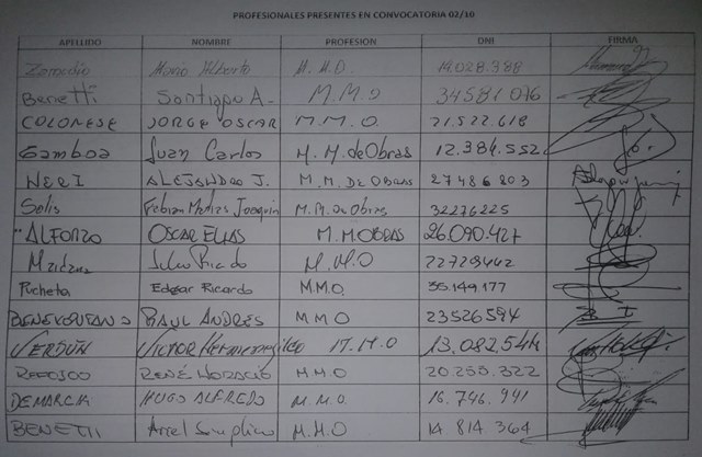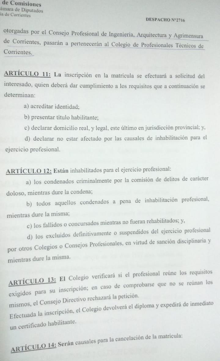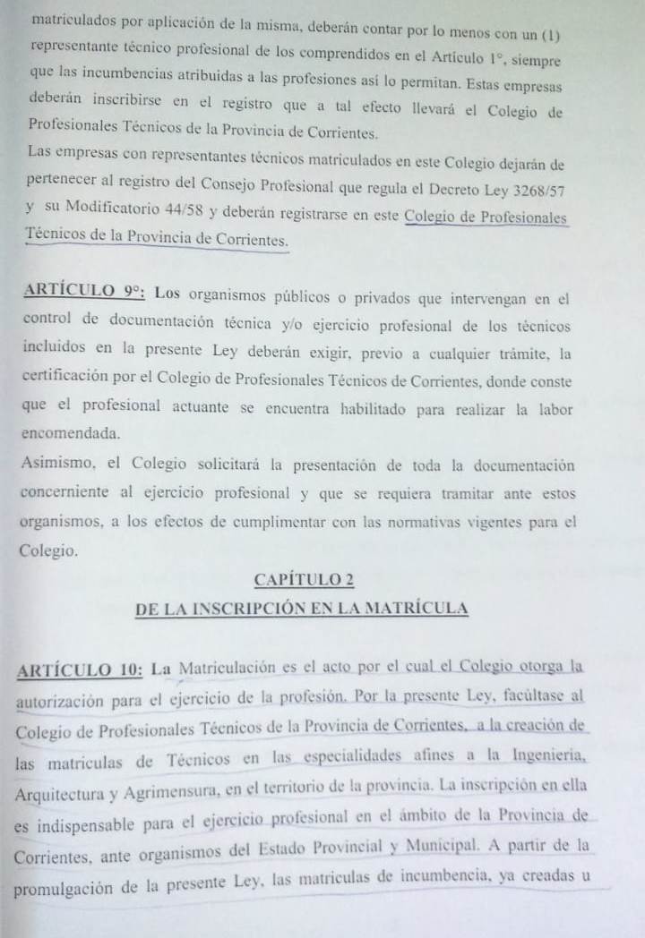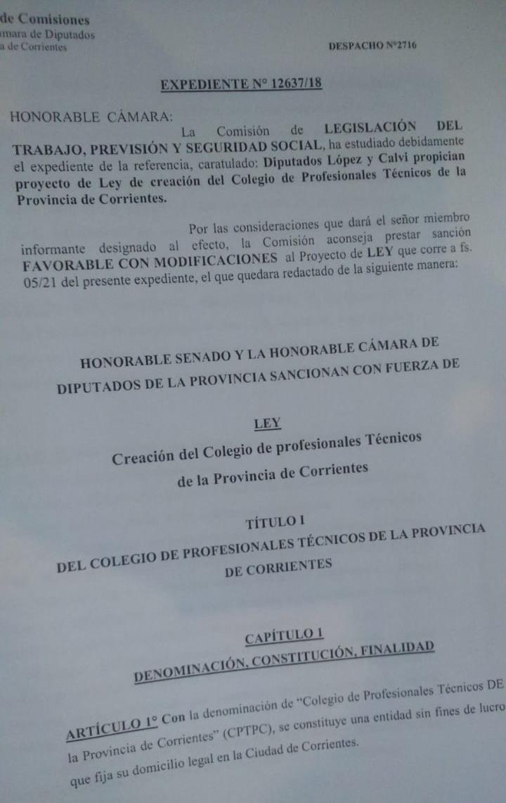 Los técnicos matriculados de la ciudad de Goya, en su mayoría Maestro Mayor de Obras, nos manifestamos en el RECHAZO al proyecto de ley (Expet. Nº 12637/18), presentado ante la Cámara de Diputados de la Provincia de Corrientes, en autoría caratulado: Diputados López – Calvi. Hacemos notar nuestro malestar ya que JAMAS fuimos consultados de esta iniciativa perteneciente a un grupo minúsculo de la capital correntina, quienes no son representativos, ante la gran cantidad de Técnicos de la provincia. El mismo descontento y repudio lo han hecho saber colegas de toda la provincia, con quien mantenemos un dialogo fluido, permanente y de total acuerdo. Este proyecto de Ley, promovido por la minoría absoluta la llevan a cabo los Diputados de nuestra ciudad, quienes jamás se acercaron a preguntarnos su iniciativa, ni siquiera, por lo visto, saben nuestra realidad; es por ello que nos convocamos los matriculados en nuestra cede, los firmantes, en defensa de nuestra actividad profesional, considerando un atentado a nuestro trabajo que hoy en día se ve seriamente dañado por la situación económica actual, sin imaginar sobre el impacto social que tendría este proyecto de separación y creación de nuestra entidad. Hoy pertenecemos al consejo profesional de la ingeniería, arquitectura y agrimensura de la Provincia de Corrientes (CPIAyA) con sede central en capital y sus distintas delegaciones en el interior de la provincia, en Goya contamos con propia sede desde hace 15 años, donde además contamos con las instalaciones para desarrollar distintas actividades en el plano laboral y de esparcimiento. Por ello los técnicos de la ciudad de Goya decimos: -NO al proyecto de colegiación de “profesionales técnicos de la provincia de Corrientes” (CPTPC). -NO a la aprobación del proyecto de ley impulsado por los diputados López y Calvi (expte. Nº 1263718). Por ultimo creemos que los matriculados que ya somos parte de este Consejo debemos resolver las cuestiones dentro del ámbito institucional y la innecesaria e improcedente presentación y promoción de la futura norma, M.M.O Ariel Benetti Mat. 995 Delegado GOYA