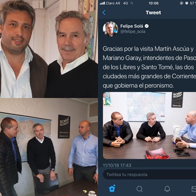 El congresal del partido justicialista Ariel Pereira, se reunió con el diputado nacional Felipe Sola uno de los presidenciales para el 2019 junto a los intendentes de Santo Tome y de Paso de los Libres. Ariel Pereira le manifestó a Sola algunas de las problemáticas centrales a resolver en Goya y que deben ser atendidos de forma urgente en caso de ser electo presidente de la nación, entre esos temas, el precio de la energía eléctrica, el combustible, salarios atrasados, falta de trabajo y salud. Además Pereira confirmo la visita de Felipe Sola a Goya para noviembre.