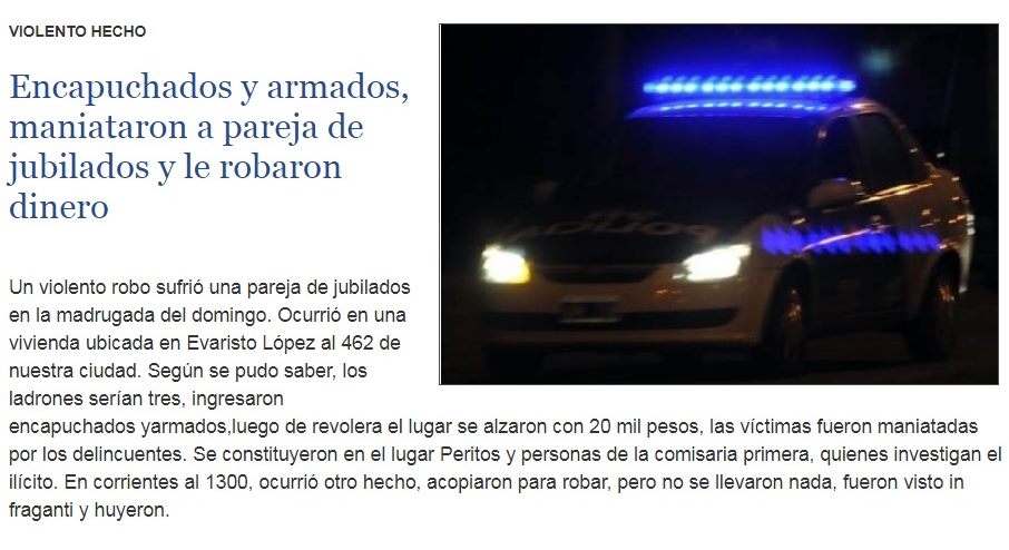 La policía logró detener a los delincuentes que maniataron y robaron a una pareja de jubilados en una vivienda ubicada por Evaristo López 462, el pasado domingo 9 de septiembre tal como lo reflejo TNGoya.com. Fueron capturados en la localidad de Amado Bonpland son tres los detenidos y están alojados en la comisaría primera, en el ilícito se alzaron con $20.000 en efectivo ahora están a disposición del juzgado de instrucción Nº1.