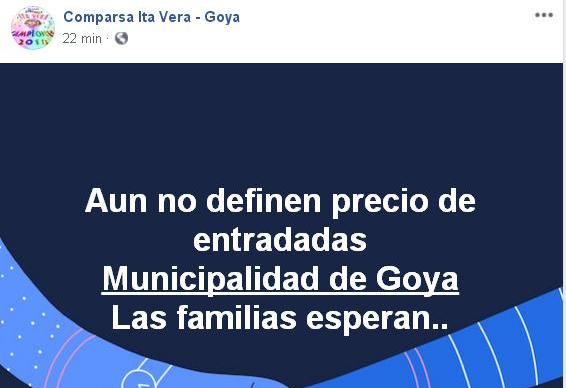 Todo se dio por una publicación donde la municipalidad promociona un evento de cumbia alli Ita vera dejo en claro i posición y reclamo. Comparsa Ita Vera - Goya Este evento es una ofensa para los bailarines que trabajan todo el año. Queremos saber los precios de entrada al carnaval, cuando estarán las anticipadas? Comparsa Ita Vera - Goya Y los carnavales? Queremos las anticipadas... Las familias quieren saber precios. Cuanto más vamos a esperar?
