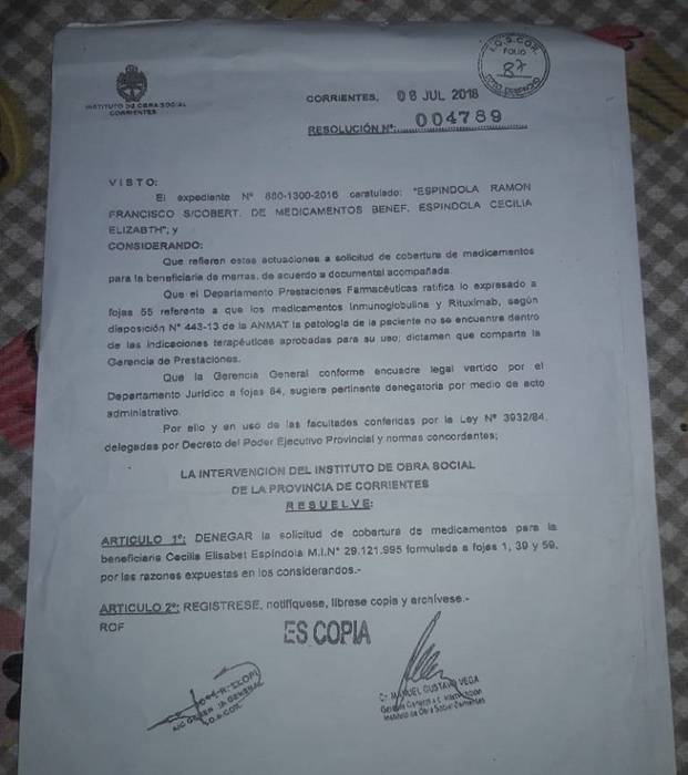 A solicitud de los médicos neurólogos que la atienden desde 2015, gestiona ante el IOSCOR la inmunoglobulina RITUXIMAB, medicamento probado con excelentes resultados. Las ampollas necesarias para un año son negadas sistemáticamente por el Instituto, con la excusa que el mismo no es específico para la enfermedad. En su reemplazo ofrece la compra de otras más baratas a pesar pero que tampoco son de receta habitual para estos casos. El Rituximab es altamente aconsejado por los especialistas para el tratamiento y la obra social de Corrientes la niega por cuestión de economía a pesar de los múltiples reclamos jurídicos iniciados por Espíndola. La medicación vale aproximadamente medio millón de pesos para los 12 meses que dura el tratamiento.