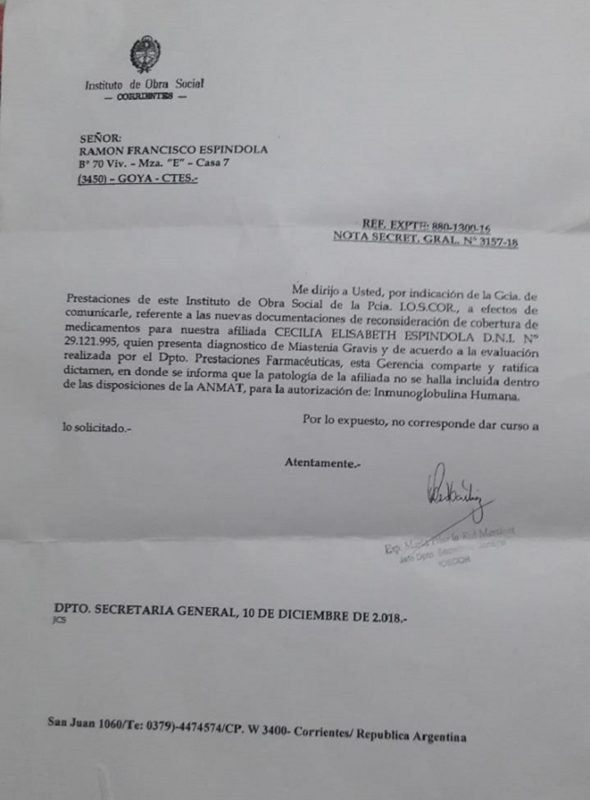 Ella misma describe su situación: “estoy al borde de entrar en otra crisis donde uno se queda sin fuerzas, no se pueden abrir los ojos ni la boca, la lengua se adormece, un estado parecido a la muerte, entubada para recibir oxígeno. Mi madre se encarga de mis cosas porque hay días en los que no me puedo mover ni hablar. Para colmo, estuve un mes en el Hospital Escuela de Corrientes para el recambio de plasma y me contagié con una bacteria que casi me mata. Mandé mensajes, correos y demás a fundaciones, políticos y a quienes consideré que me podrían ayudar, pero nadie ha respondido”. Quienes puedan colaborar con Cecilia pueden contactarse al teléfono móvil +54 9 377 769-7365, como Cecilia Espindola en Facebook e Instagram, ceciespin2009 en Twitter, o por mail a ceciespin2009@hotmail.com.