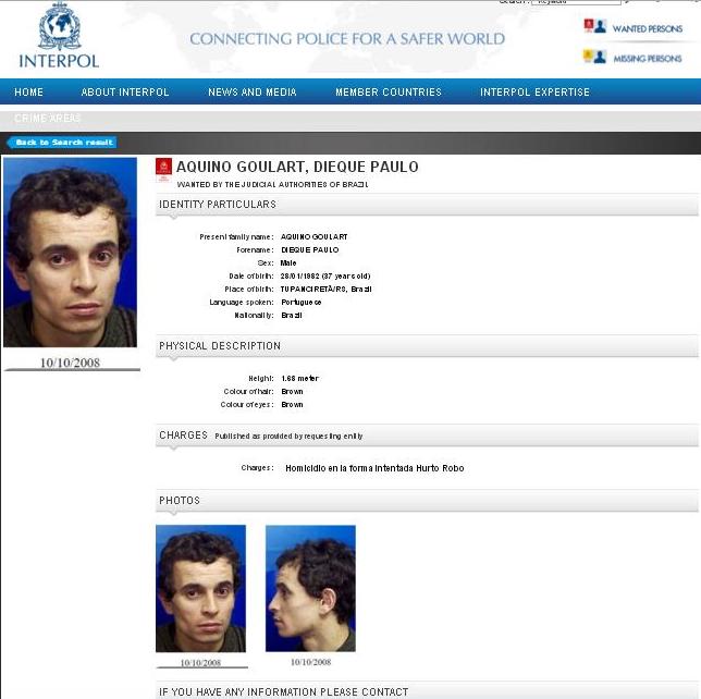 La información llegada desde Brasil: DIEQUE PAULO AQUINO GOULART, de 37 años de edad y estaba prófugo hace 3 años por robo de residencia, porte ilegal de armas de fuego, homicidio, robo de vehículo, robo simple en la residencia, robo calificado, tráfico de drogas, robo de la residencia con lesiones. Tiene pedido de prisión por haber matado a un policía de Brasil y aquí en Argentina habría mentido su nombre.