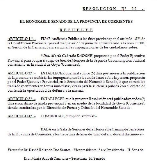 Firmado: Dr. David Rolando Dos Santos – Vicepresidente 1º a/c Presidencia – H. Senado Dra. María Araceli Carmona – Secretaria - H. Senado