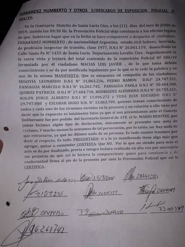 Los inspectores involucrados son Fernández Humberto, Segovia Leonardo, Pedro Ramón, Paniagua Marcelo, Paniagua Paola, Quiroz Patricia, Rodríguez Alfonsina, Rolón Jorge Alberto, Vera Juan Eduardo y Escobar Hugo, quienes declararon en sede policial distrito Santa Lucia el 11 de junio.