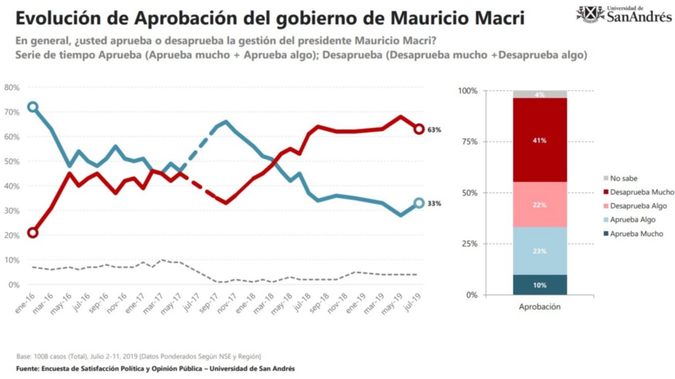 Pero tras sus cuatro años de gestión, con crisis económica, devaluación de la moneda y pobre del 35%, se vino abajo. A un mes de las PASO, está en un punto bajo teniendo en cuenta que se viene un año electoral clave. Además, tiene una imagen negativa bruta del 61, según una importante encuesta de la Universidad de San Andrés.