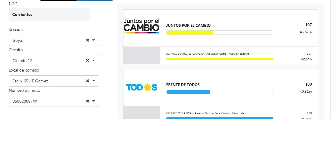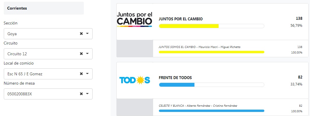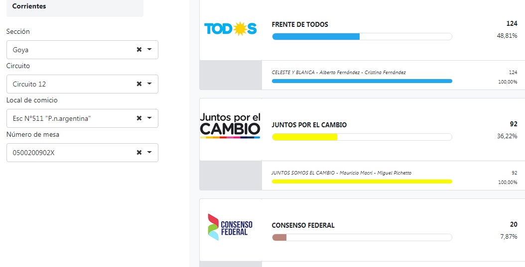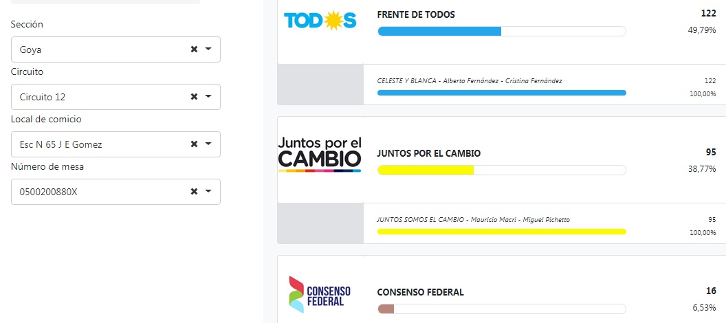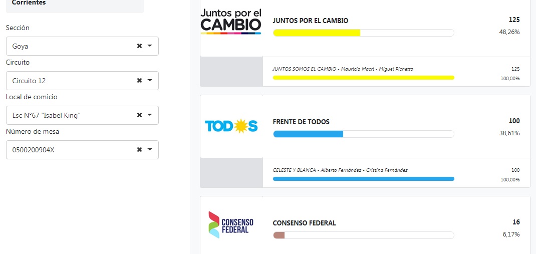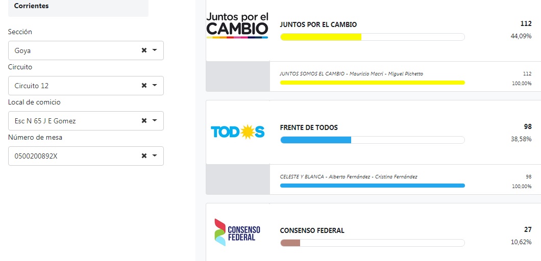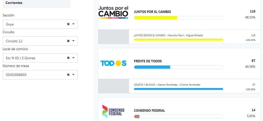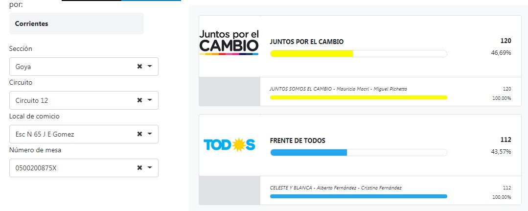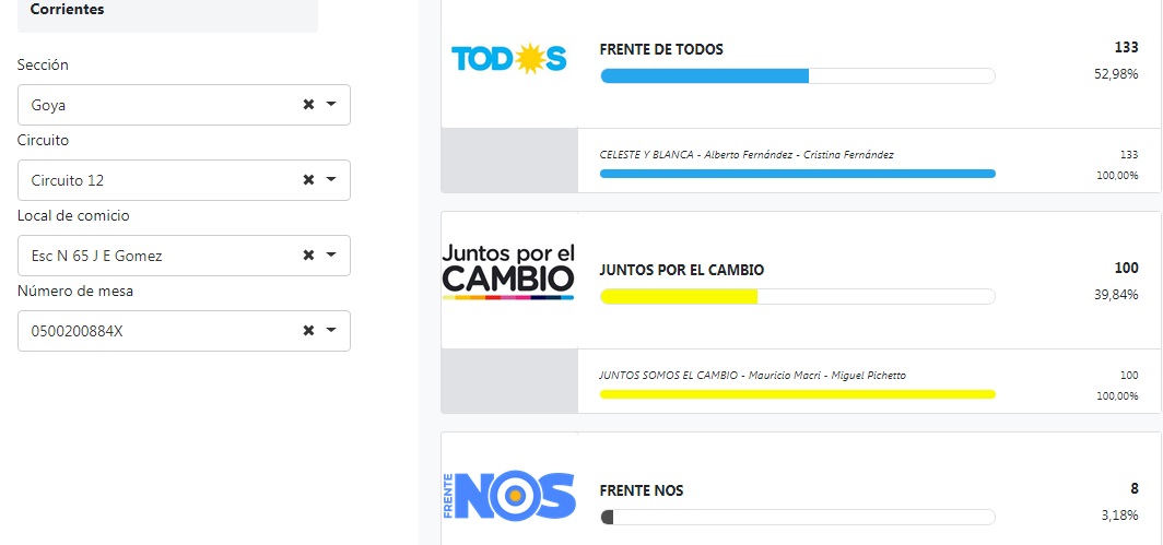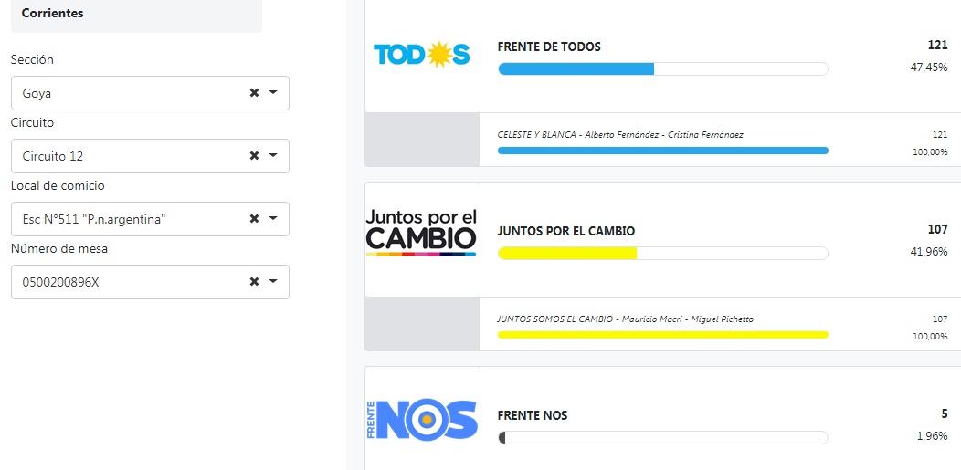 Tras el triunfo de la fórmula Fernandez Fernandez desde TNGoya te mostramos mesa por mesa los resultados que dejó las paso en Goya. En el circuito 12 votaron 8761 personas de los cuales 4048 para Juntos por el Cambio y 3424 para el Frente de Todos. Mira las mesas en la nota.