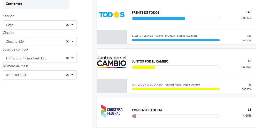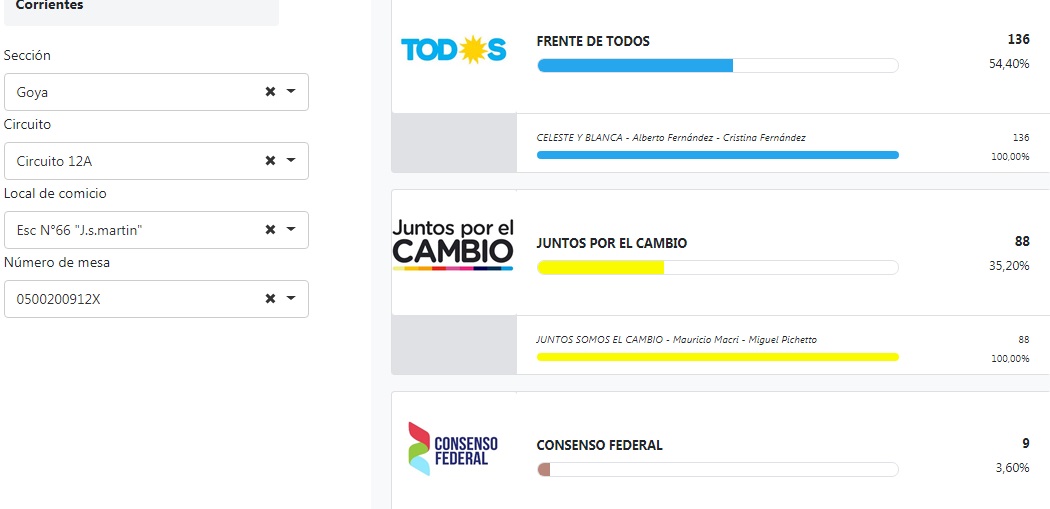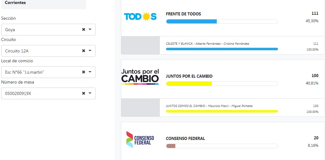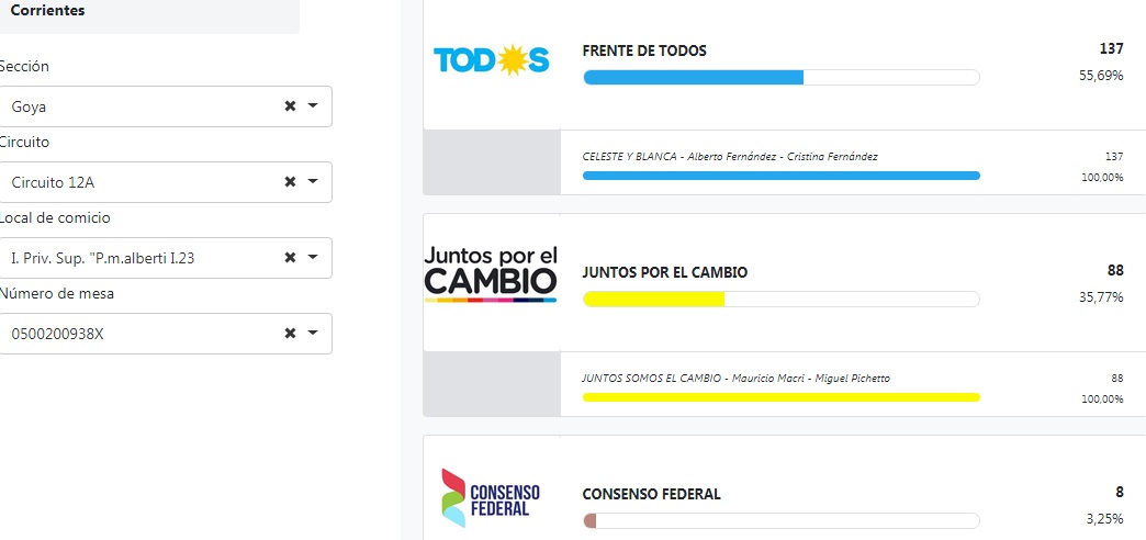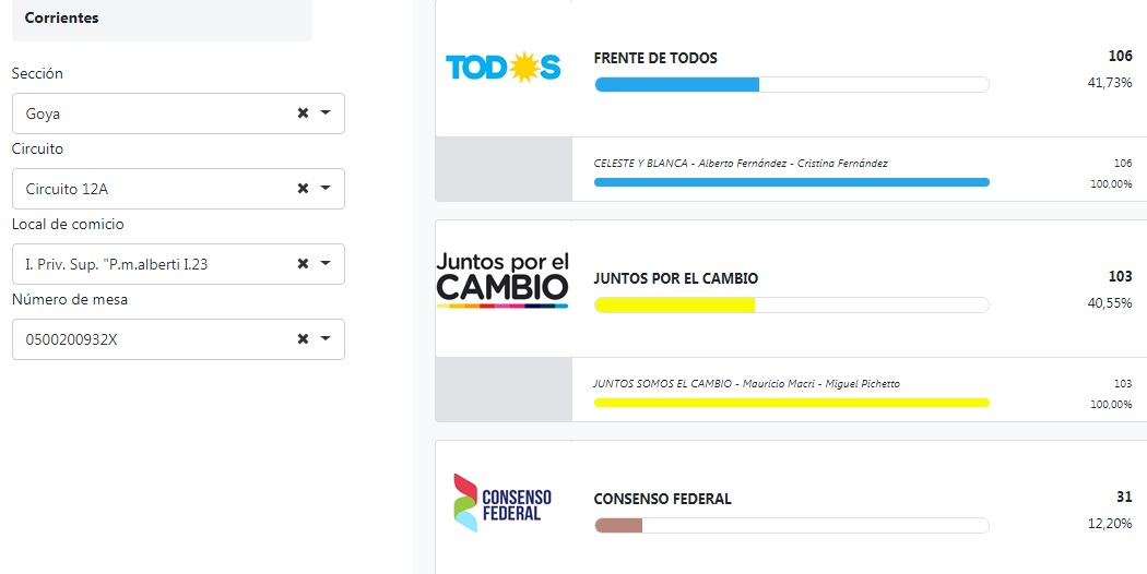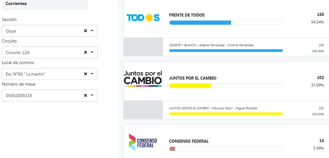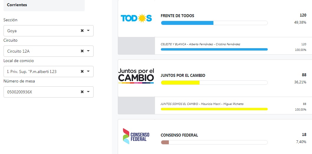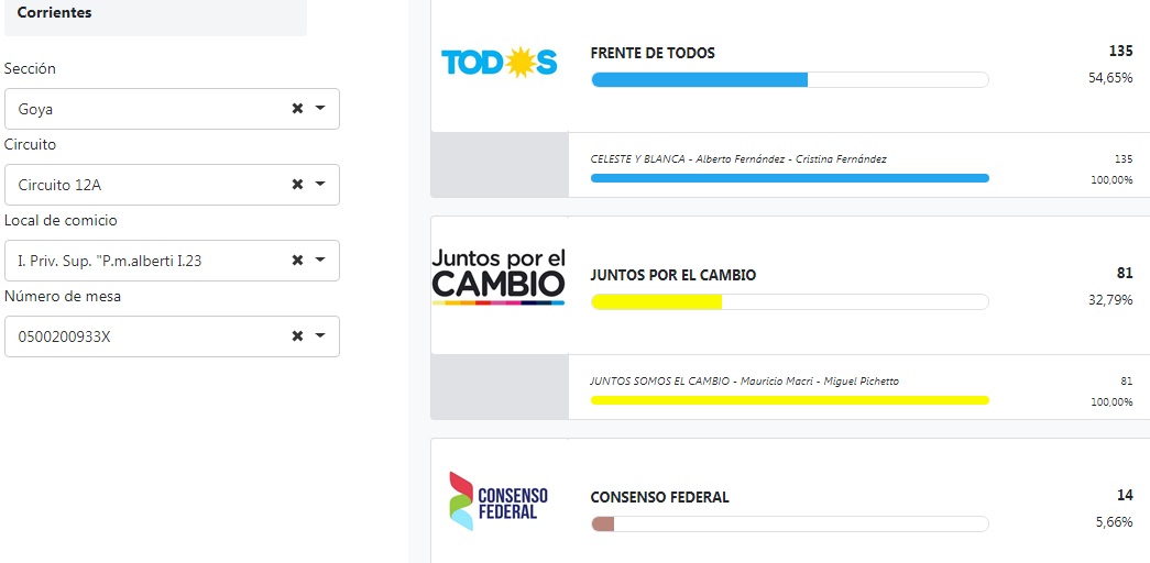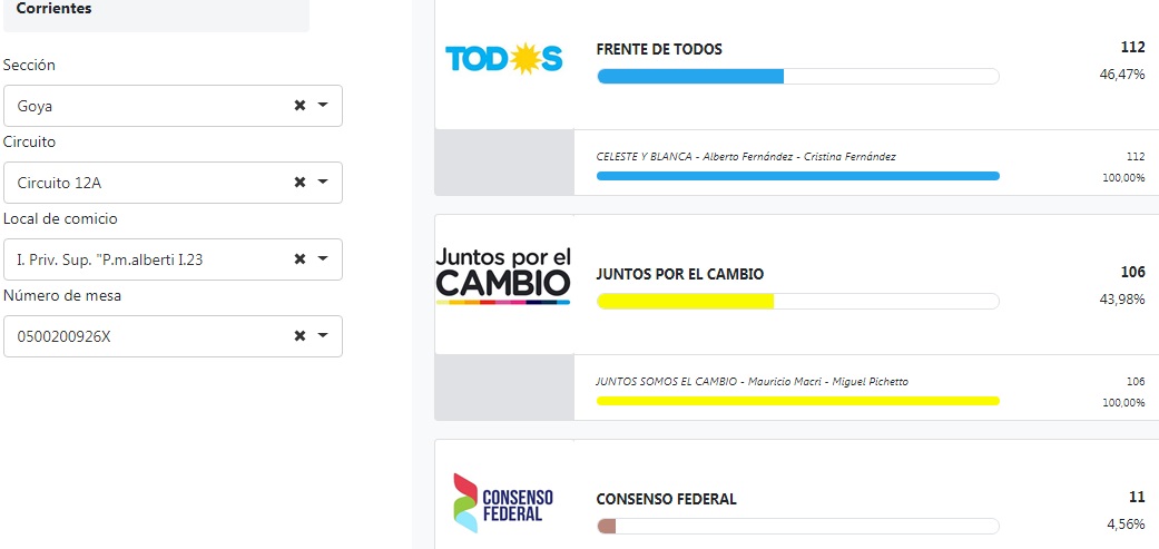 Con un total de 11.119 electores en el Circuito 12A se impuso Alberto Fernández y Cristina Fernández de Kirchner, la cantidad de votos que tuvieron fue de 5.705. Mientras que la fórmula de Macri juntó solo 3.844. Mira mesa por mesa en la nota.