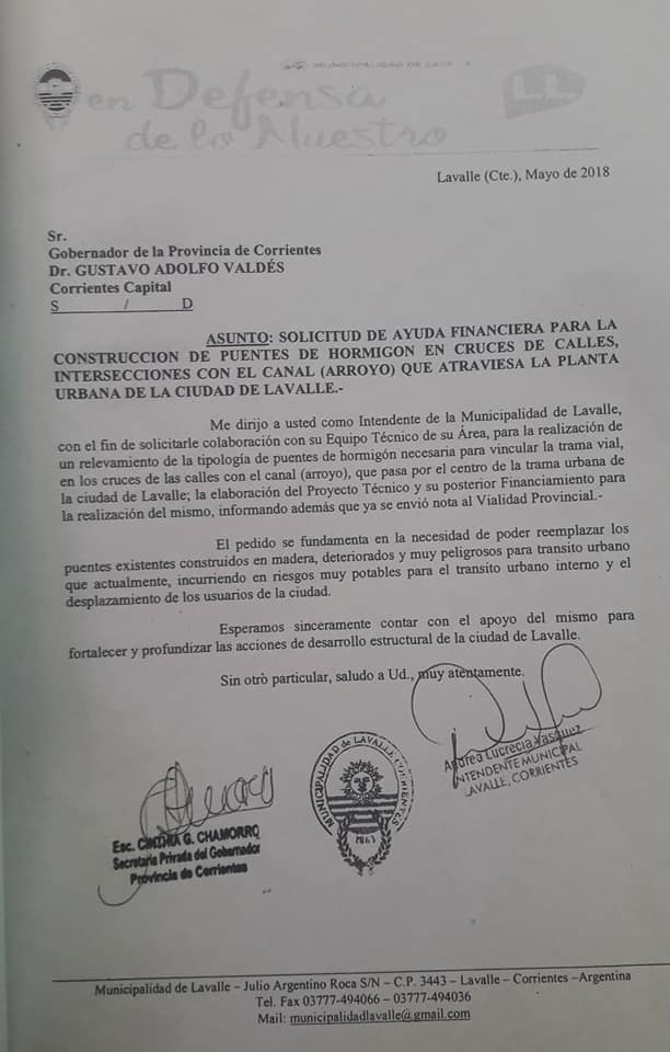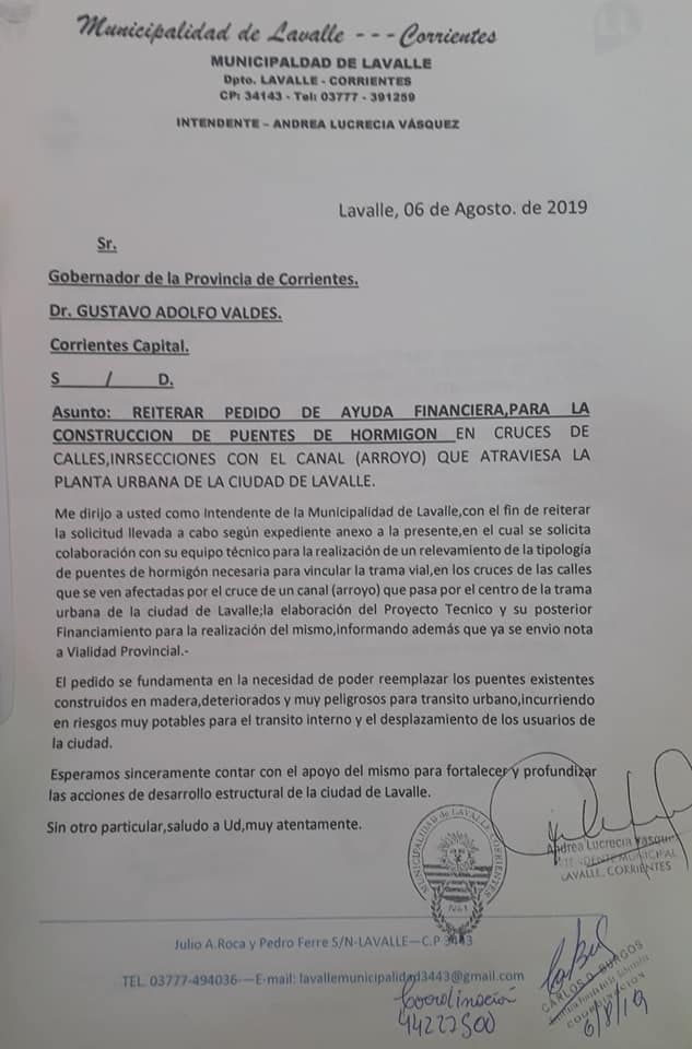 La Municipalidad de Lavalle aún espera respuesta del Gobierno Provincial. La Intendente Lucrecia Vásquez, hizo la solicitud de ayuda al gobernador Gustavo Valdés, para la construcción de un puente de hormigón, para poder reemplazar el existente construido en madera, deteriorando y muy peligroso para el tránsito. Se entregó una nota en mayo del año 2018 y se reiteró el pedido en agosto del corriente año. Lamentablemente hasta el día de hoy no existió ningún tipo de respuesta.