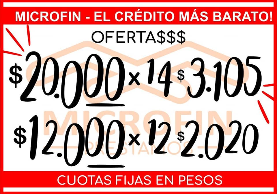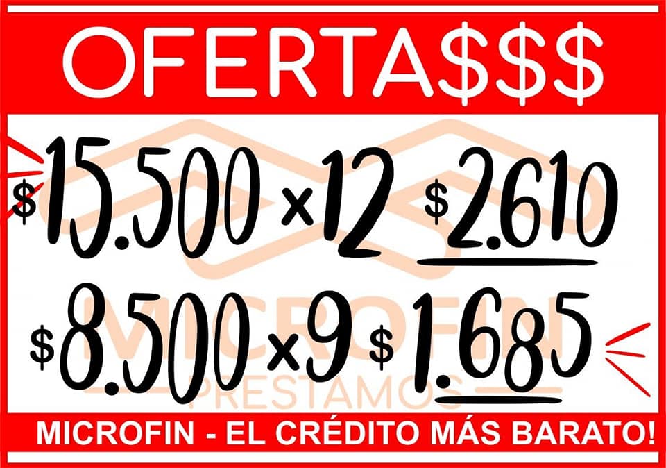 El crédito más fácil de obtener y barato ahora en cuotas fijas a cargo de “MICROFIN prestamos”, podes encontrarlos en calle Colon 1055 local 1, además de comunicarte al celular 3777-725348. Las promociones de hoy son préstamos de $8.500 en 9 cuotas de $1.685, o $15.500 en 12 cuotas de $2.610 y $20.000 en 14 cuotas de $3.105.