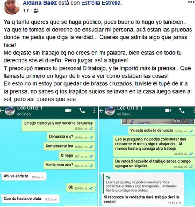 Posteriormente y ante la mediatización del caso, Aldana, quien estaba trabajando hasta ayer, publico en Facebook los Chat de WhatsApp, del momento cuando avisa del ilícito.