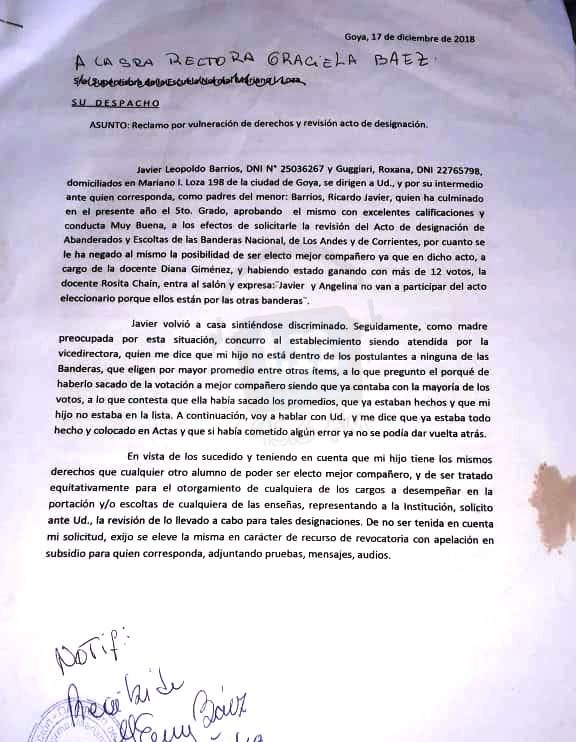 Roxana se comunicó con la redacción de TNGoya y pidió que su caso no quede en silencio ya que los chicos son los que más sufren. LA HISTORIA Hola yo quiero contar algo que me paso con mi niño en la escuela normal, quizas de poca importancia para muchos pero que a mi hijo y por ende a toda la familia nos choco fuerte, porque la tristeza de mi niño impacto en todos los que le queremos. Esto paso el 26 de noviembre del año pasado, ya paso casi un año pero a pesar de los reclamos , cartas notas y pruebas el directivo de la escuela no me dieron una solución. Mi hijo saco la mayoría de votos cuando votaron por mejor compañero, o sea q salió para llevar la bandera de corrientes, pero la docente a cargo le dijo que no, que vuelvan a votar pero q no le voten a él. Mi niño no entendía por qué le descalificaron y la docente le dice que el no podía participar porque tenia mejor promedio y que el estaba por la bandera Nacional. Cuando el sale de la escuela llego muy triste me cuenta lo sucedido , entonces fui al otro día y hable con la docente ,donde me confirma lo que le dijo a mi hijo, yo no dije nada y trate de hacerle entender a mi niño que no podía llevar las 2 banderas la del mejor compañero ni la del mejor promedio , el quedo más tranquilo, pero llegado el momento de designar a mi hijo no le dieron nada, fue ahí donde nos quebramos todos. Hice notas, tengo pruebas de wasap de sus compañeros donde me dicen que el salió mejor compañero pero que la seño lo descalifico por mejor promedio. La docente es Diana Gimenez de 5to grado A. Esa es la nota que yo entregue, y otra igual a la rectora de la tarde.