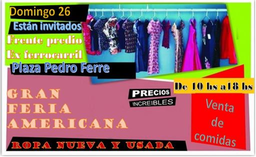 Este domingo habra gran feria americana en plaza Pedro Ferre ubicado frente al ex ferrocarril de nuestra ciudad, la hora estipulada es de las 10 hs y se extebdera hasta las 18 hs, donde ademas de venta de ropas nuevas y usadas habra venta de comidas.