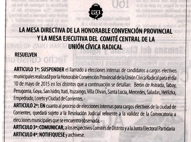 La Unión Cívica Radical provincial decidió suspender el llamado a elecciones internas de candidatos a cargos electivos municipales, dispuesto por la convención partidaria para el 10 de mayo próximo, en una quincena de municipios. Entre ellos Goya y ya se desato el escándalo donde los candidatos de una línea interna irán a la justicia para revertir esta decisión.