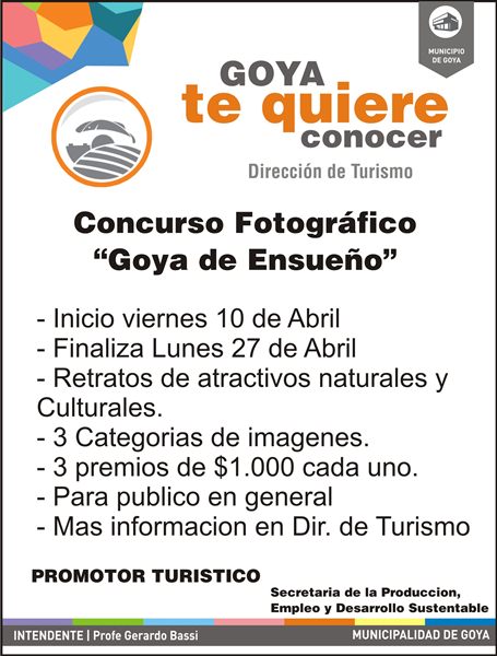 En adhesión a la 40º Fiesta Nacional del Surubí, la Dirección de Turismo de Goya recuerda que está abierta la convocatoria a todos los amantes de la fotografía para participar del Primer Concurso “Goya de Ensueño”, en el que se distribuirán importantes premios en sus diferentes categorías. Es gratuito.