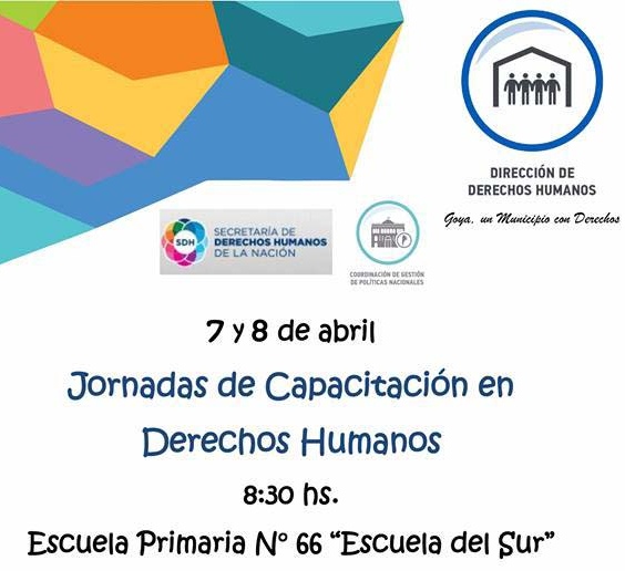 La Dirección de Derechos Humanos recuerda a los interesados que se encuentra abierta la inscripción para las Jornadas de Capacitación en Derechos Humanos, a cargo de la Escuela de Formación en Derechos Humanos de la Nación, que se llevarán a cabo los días 7 y 8 de abril en horarios de 8,30 a 12,00 y de 15,00 a 18,30 en la Escuela N°66 “Gral. José de San Martín”.