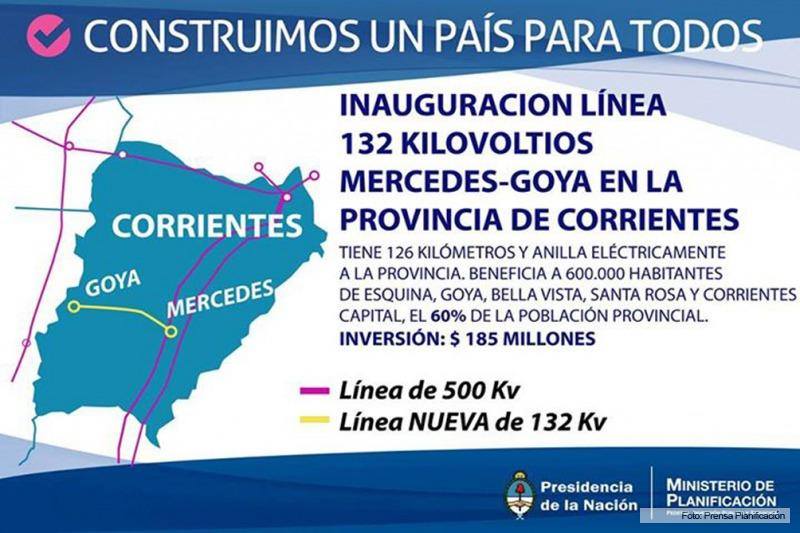 Cristina Fernández de Kirchner inauguró -a través de una videoconferencia una línea de alta tensión de 126 kilómetros de extensión que une las localidades de Mercedes y Goya. El tendido, de 126 kilómetros, "anilla eléctricamente la provincia de Corrientes, beneficiará a 600.000 habitantes de Esquina, Goya, Bella Vista, Santa Rosa y Corrientes Capital, y tiene una inversión total de 185 millones de pesos", indicó, por su parte, el Ministerio de Planificación Federal en un comunicado.