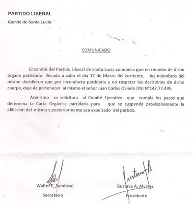 Desde “Construcción liberal” de Santa Lucía emitieron un comunicado por considerar que fue incorrecta la decisión que habría adoptado el comité ejecutivo del PL de esa localidad para expulsar a uno de sus integrantes. “En primer lugar, desconocemos lo resuelto por el “Comité Ejecutivo del Partido Liberal” de Santa Lucía en su reunión del martes 17 de marzo de 2015. Consideramos autoritaria, antidemocrática y carente de validez, la solicitud al Comité Ejecutivo Provincial de suspender y posteriormente expulsar del Partido Liberal a Juan Carlos Oviedo”, comienza diciendo el escrito.
