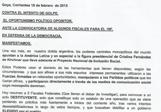 Mediante un comunicado de prensa que se reproduce a continuación, distintos partidos políticos, agrupaciones, y dirigentes goyanos, expresan que la marcha convocada por los fiscales "es un acto destituyente que busca avanzar contra las conquistas y derechos adquiridos por el pueblo, para conservar su poderío económico y político". SIGUE EL COMUNICADO