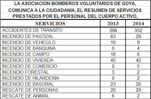 La asociación de bomberos voluntarios de Goya dio a conocer el resumen de servicios prestados por el personal del cuerpo activo, del cual se destaca en primer lugar que los accidentes de tránsito bajaron un 11.5% comparando con el 2013. Total de accidentes de tránsito registrados en 2014 352, en 2013 398. De los 352 accidentes se registraron 16 víctimas fatales. Ver en detalle el informe.