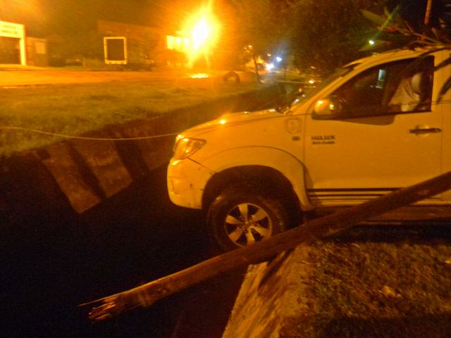 En la noche del domingo por Avenida del Trabajo entre las intersecciones de Corrientes y Bartolomé Mitre, una camioneta 4x4, Toyota Hilux, casi cayó por completo dentro de un canal abierto. El conductor del rodado dejo en marcha y un niño subió toco el acelerador y siguiio su mnarcha, atropellando un poste del servicio de cable, terminando la marcha sobre dicho lugar, quedando atascada. IMAGENES
