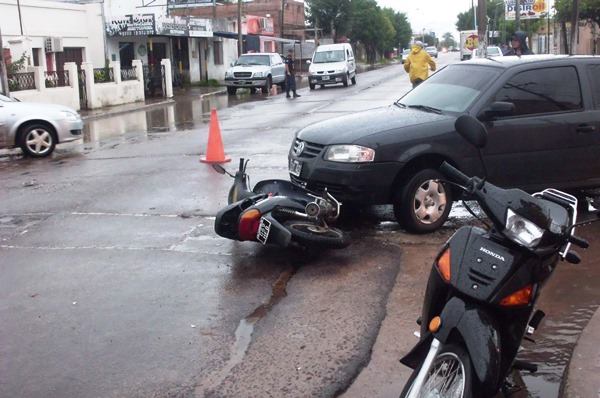 En pleno chaparrón casi llegando a las 08 hs por Avda J.J. Rolón y Juan Pujol un automóvil Volkswagen gol color negro y una motocicleta Guerrero Trip protagonizaron un accidente, quedando el rodado menor incrustado en la parte delantera del otro rodado. El lesionado fue asistido por Bomberos y luego trasladado al nosocomio local.