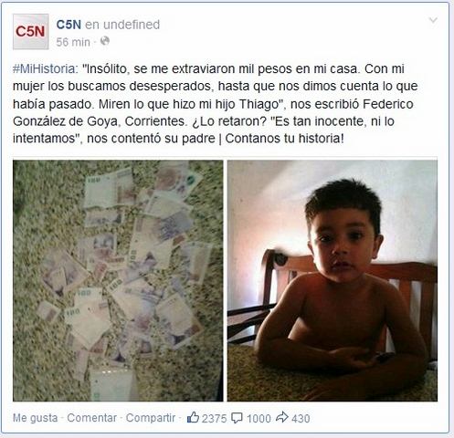 "Insólito, se me extraviaron mil pesos en mi casa, conto un padre y confeso que junto a su mujer los buscaron desesperados, hasta que se dieron cuenta lo que había pasado. Miren lo que hizo mi hijo Thiago", FOTO. escribió Federico González de Goya, Corrientes. A C5N, ¿Lo retaron? NOOOOO, "Es tan inocente, ni lo intentamos", contó su padre.