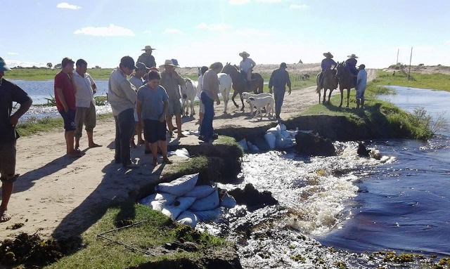 El intendente de San Isidro la señora Vilma Ojeda junto al equipo de trabajo la totalidad de los empleados municipales, intentan frenar el avance de las aguas colocando bolsas de arenas junto a la ruta comercial 14 de los parajes, ruta principal y fundamental para la vida de los que allí residen.