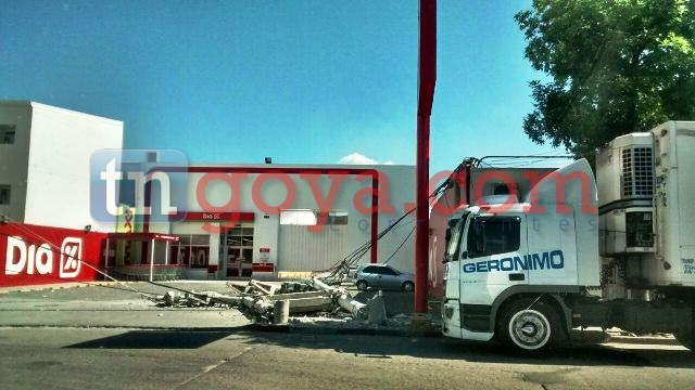 El hecho ocurrió en el acceso al supermercado que funciona frente a la terminal de ómnibus alrededor de la 16, cuando el conductor del camión de la empresa Geronimo identificado como Campos salvador Antonio tigre bs as, maniobraba para ingresar a la playa de un supermercado que se encuentra por calle España donde traía mercaderías para descargar. La columnas fueron derribadas y con ellas el transformador que alimenta gran parte del microcentro goyano, por lo cual toda la zona permanece sin energía eléctrica.